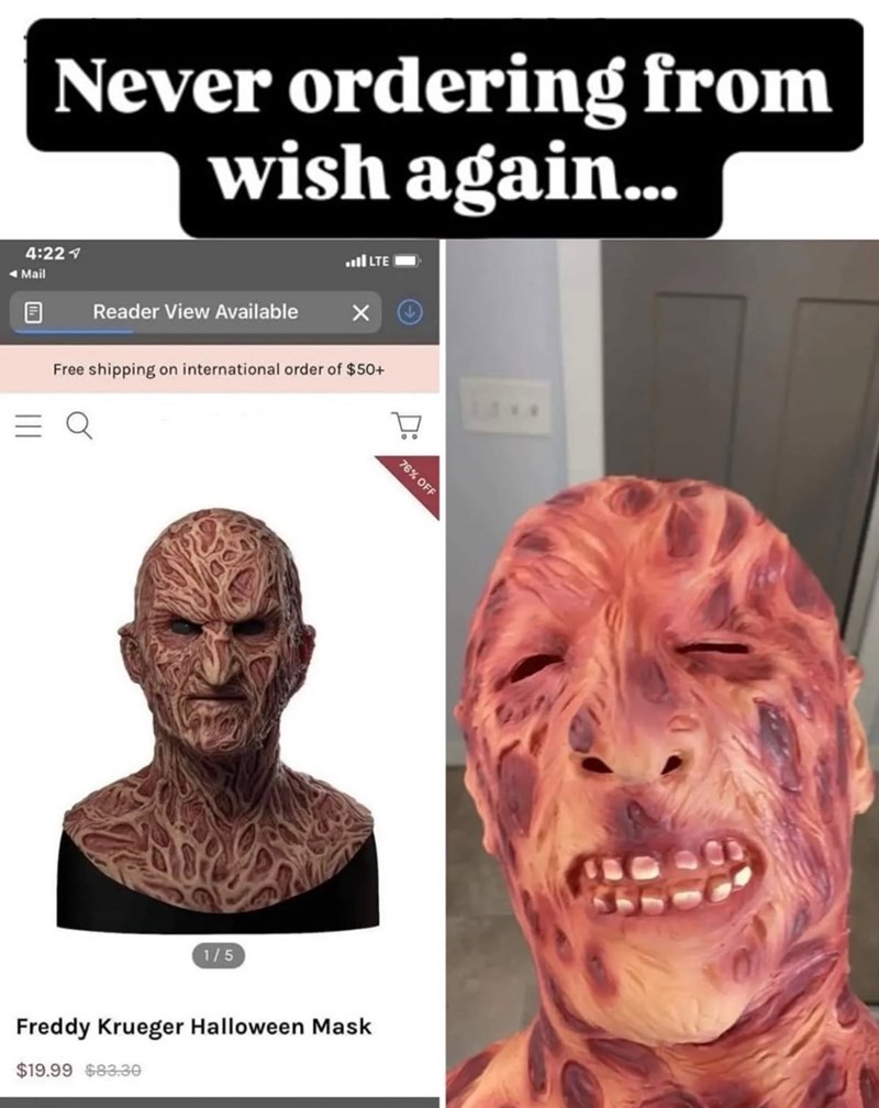 HomeFun Fun Expectation vs Reality: Wish Costume Mask Edition By Alex 31.12.2025 0 29 “Never ordering from Wish again…” — honestly fair. Previous articleTOP 10 HORROR MOVIES OF 2025 (RANKED BY IMDb)Next articleKiller Whale (2026) Official Trailer AlexI love movies and sharing what makes them special. From hidden gems to big blockbusters — there’s always something worth talking about. Related Articles News Ghostface Returns: Scream 7 Trailer Brings Sidney Prescott Back Into the Nightmare News New Trailer Arrival: Blood Covenant Brings Creepy Sins and Sinister Rituals With Maika Monroe and Joe Keery News New Bad Voodoo Trailer Unleashes Sinister Convict Nightmare Ahead of DVD Release Subscribe Login Notify of new follow-up comments new replies to my comments Label {} [+] Name* Email* Website Label {} [+] Name* Email* Website 0 Comments Oldest Newest Most Voted Inline Feedbacks View all comments Stay Connected0FansLike0FollowersFollow0SubscribersSubscribe Latest Articles News Ghostface Returns: Scream 7 Trailer Brings Sidney Prescott Back Into the Nightmare News New Trailer Arrival: Blood Covenant Brings Creepy Sins and Sinister Rituals With Maika Monroe and Joe Keery News New Bad Voodoo Trailer Unleashes Sinister Convict Nightmare Ahead of DVD Release Video It Will Find You | Official Trailer Articles Horror Movies Based On True Stories Load more